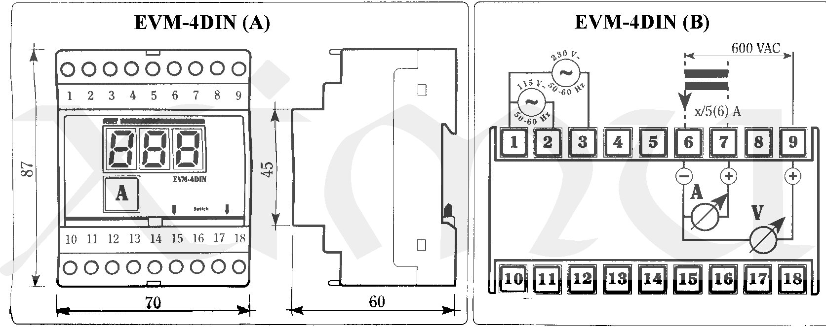 Ampérvoltmetr EVM-4DIN, x/5A, 600V
