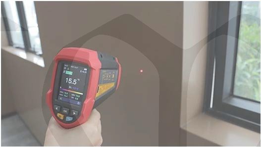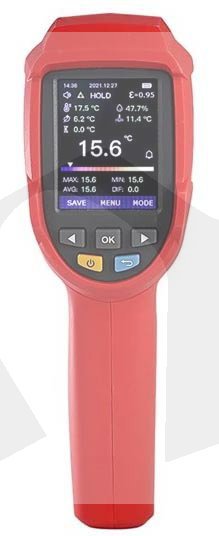 Profesionální bezkontaktní infračervený teploměr UT-305A+ dokáže rychle a přesně určit povrchovou teplotu v rozmezí -50°C až +1850°C změřením infračervené energie vyzařované z cílového povrchu. Pro snazší a intuitivní zaměření přístroje na cílový povrch je zabudován laser, který indikuje správné zamíření teploměru. Poměr vzdálenosti k průměru měřeného povrchu je u tohoto přístroje 55 :1. Tento teploměr má zabudované další funkce, např. měření teploty okolí teploměru, měření teploty kontaktním termočlánkem typu K, měření relativní vlhkosti okolí teploměru. Na základě těchto změřených hodnot sám vypočte teplotu rosného bodu nebo teplotu vlhkého teploměru. Do teploměru je možné zadat systémový čas a datum. Měření hodnot je možné naplánovat v předem stanovených intervalech a celkem 999 událostí (skupin dat) uložit do interní paměti. Je možné přednastavit emisivitu měřeného povrchu v rozmezí 0,1 až 1,0. Indikaci přednastavených funkcí a naměřených hodnot zajišťuje jasný a vysoce kontrastní TFT LCD barevný displej a hraniční hodnoty jsou indikovány bzučákem a na displeji. Je možná indikace minimálních, maximálních a průměrných teplot a odchylek od průměru ( MIN, MAX, AVG, DIF ). Přístroj je odolný proti pádu z výšky 1 metru.