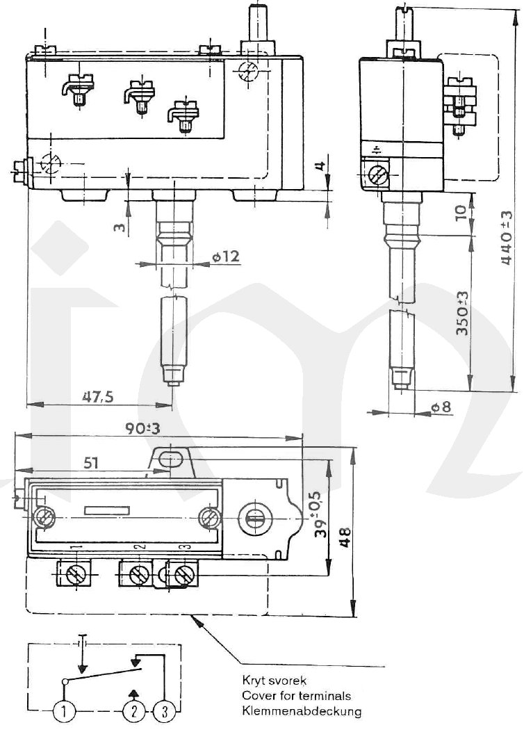 Termostaty se skládají ze dvou hlavních částí: teplotního čidla a spínací hlavice. Dilatační změny čidla se přenášejí prostřednictvím páky na spínač. Termostaty se vyrábí v provedení rozpínacím (2 svorky) nebo přepínacím (3 svorky). Svorky jsou šroubové s možností připojení vodičů s max. průřezem 4 mm. K ochranné svorce musí být připojen ochranný vodič. Standardní provedení je opatřeno krytem svorek pro zabránění náhodného dotyku. Požadavek na provedení bez krytu svorek musí být uveden v objednávce.