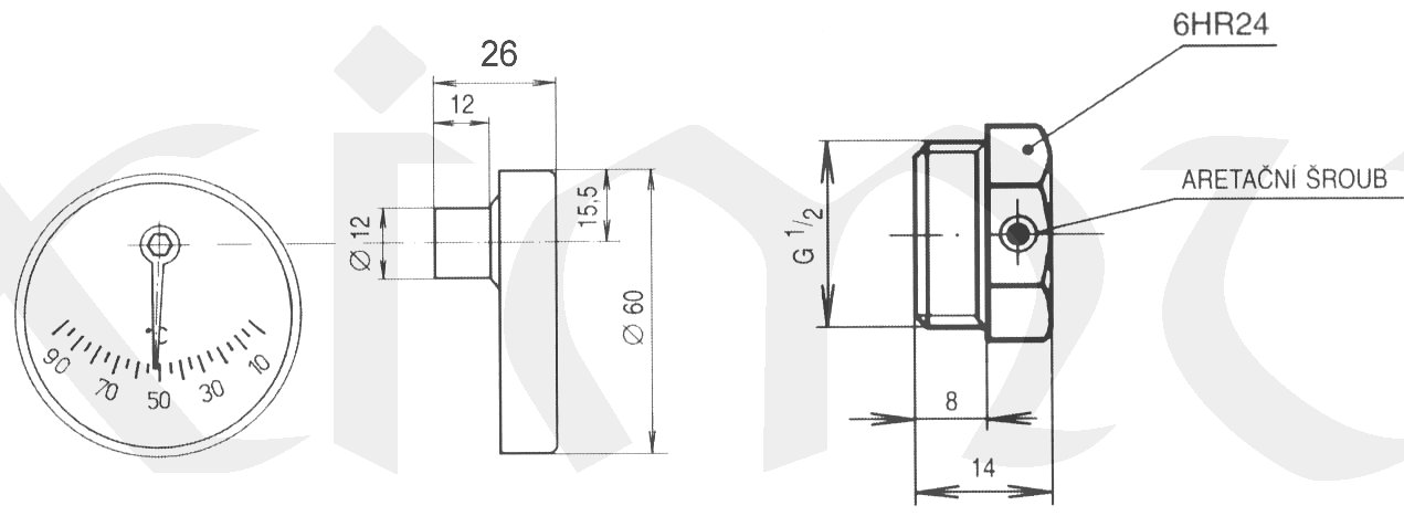 Před zabudováním teploměru je nutno do potrubí zašroubit teploměrovou jímku. Jímku dotáhnout pomocí klíče 24 mm. Čidlo teploměru zasunout až na doraz a jeho aretaci provést utažením šroubu umístěného na boční straně teploměrové jímky. Při demontáži přístroje uvolnit aretační šroub a vyjmout teploměr z jímky.