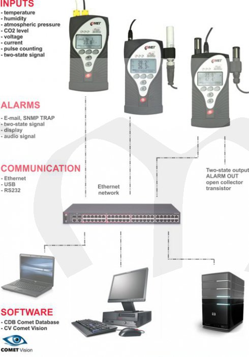 - Signalizace alarmů může být akustická (vestavěným měničem), optická (3x LED dioda), alarmovým výstupem nebo odesláním varovného e-mailu přes ethernet.