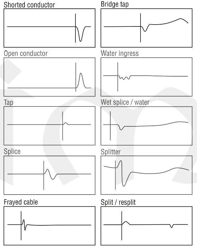 - detekce přerušení, zkratu, škody způsobené vlhkostí a dalšími změnami v impedanci kabelu.