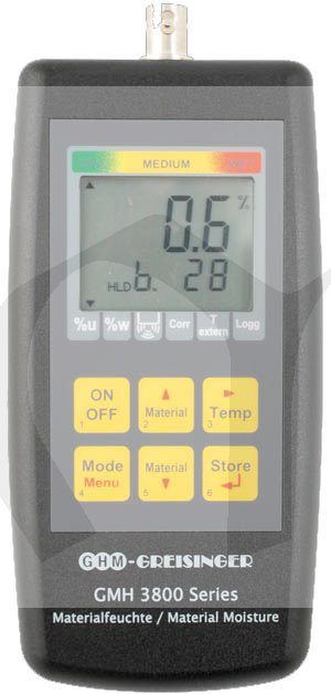 Přístroje GMH3831 nabízejí jednoduchou obsluhu, široký rozsah funkcí a vysokou přesnost měření při Vaší práci. Absolutní materiálová vlhkost pro všech 494 materiálů je přímo zobrazena na displeji přístroje. Obtížné používání převodních tabulek je nyní minulostí. Kromě zobrazení hodnoty materiálové vlhkosti je na displeji přístroje k dispozici také individuální vyhodnocení stavu vlhkosti (mokrý / vlhký / suchý), které Vás ihned informuje o stavu měřeného materiálu.