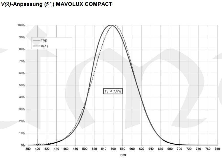 - Nízké náklady na základní zařízení jsou klasifikovány podle třídy C podle DIN 5032-7 , IEC 13032-1 Dodatek B. Vysoce kvalitní nastavení V(λ) a kosinová korekce umožňují spolehlivé měření denního světla a všech zdrojů umělého světla včetně LED.