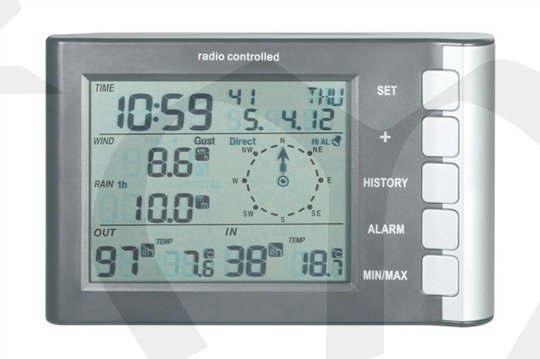 - funkce alarmu při překročení nastavených mezních hodnot rychlosti větru, úhrnu srážek, vnitřní nebo vnější teploty a vnitřní nebo vnější vlhkosti vzduchu