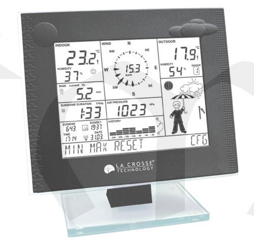 Tato nová meteostanice WS2-550 s ovládáním pomocí touchscreenu s nadčasovým vysoce lesklým designem a podsvíceným skleněným stojanem Vám na velice přehledném podsvíceném displeji zobrazí veškeré důležité informace, které se týkají počasí a času. Pokud chcete znát aktuální údaje, stačí klepnout na displej a stanice je bez odkladů ihned zobrazí. Tato rychlá stanice má možnost nastavení intervalu odečítání dat v rozsahu 2-20 sekund, tím je zaručena neustálá obousměrná komunikace. Kromě obvyklých údajů, tedy vnitřní a venkovní teplotě, číselně zobrazenému tlaku vzduchu, fází Měsíce a dalších, je na displeji i ikona panáčka, oblečeného dle počasí. Díky interní paměti umožňuje i dlouhodobé sledování počasí - lze uložit až 3000 záznamů a v případě potřeby je přenést přes USB do PC. Zde je můžete pomocí software zobrazit a analyzovat. Senzory pro tlak vzduchu, vnitřní teploty a vlhkosti vzduchu jsou vestavěny do přístroje, pro tyto hodnoty nejsou tedy zapotřebí žádné další senzory v místnosti. Ostatní data o počasí jako je rychlost a směr větru, venkovní teplota, množství srážek, vlhkost vzduchu a doba svitu slunce jsou bezdrátově přenášena pomocí senzoru.