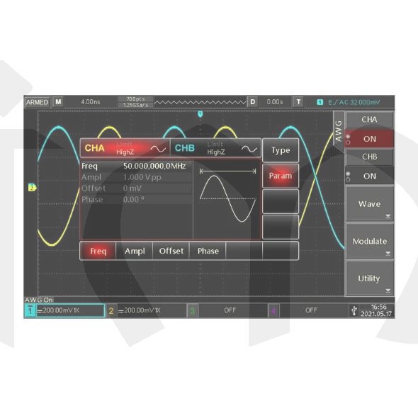 Vestavěný dvoukanálový generátor signálu 50MHz vln s průběhem sinus, čtverec, rampa (pila), puls, šum, DC a libovolná vlna. Umožňuje modulování signálů AM a FM modulací z interního zdroje a matematické operace se signály.