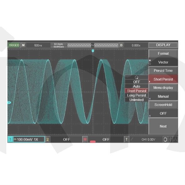 - automatické měření parametrů signálu: Max, Min, High, Low, Middle, Pk-Pk, Ample, Mean, Cycle Mean, RMS, Cycle RMS, Area, Cycle Area, OverShoot, PreShoot, Period, Freq, Rise, Fall, +Width, -Width, +Duty, -Duty, RiseDelay, FallDelay, Phase, FRFR, FRFF, FFFR, FFFF, FRLF, FRLR, FFLR, FFLF