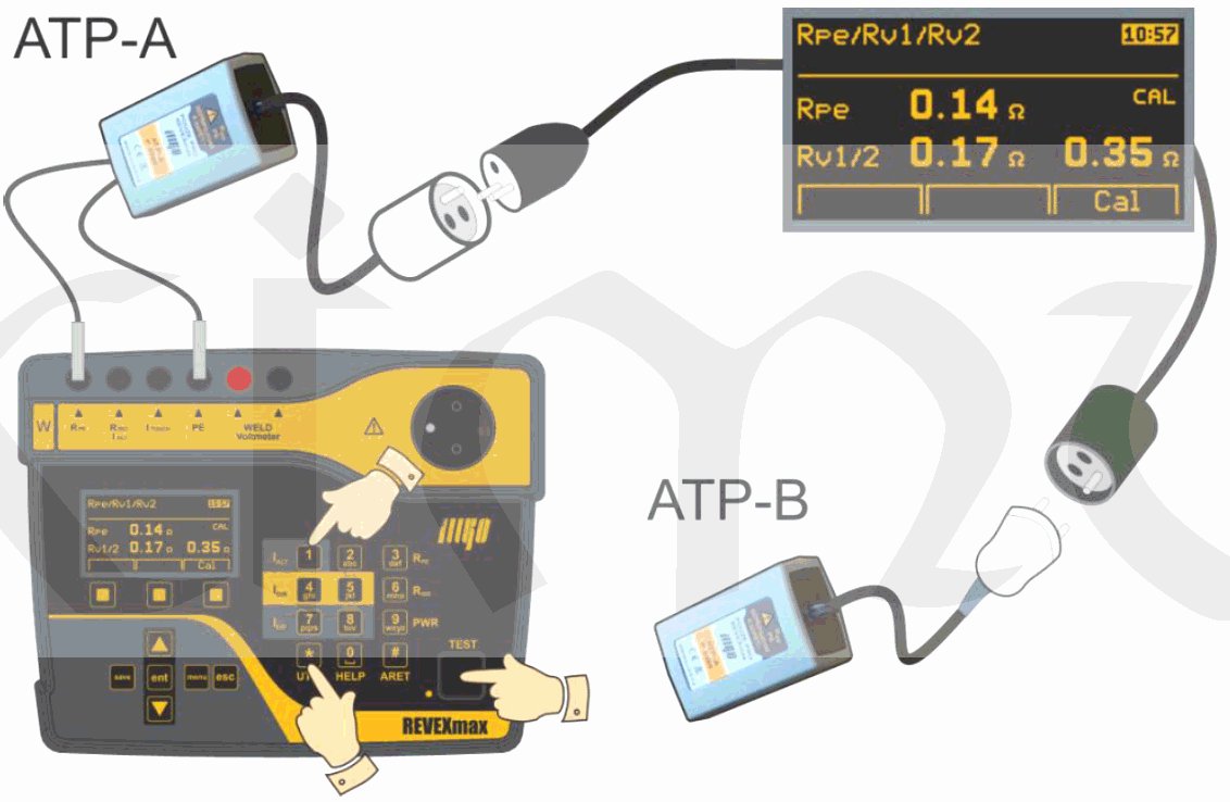 Adaptér ATP (P-8080) se sestává ze dvou částí. Přes ATP-A se k měřicímu přístroji REVEXmax připojí vidlice kontrolovaného prodlužovacího přívodu, na jehož druhém konci je do zásuvky zapojen ATP-B. Přístroj pak automaticky proměří odpory všech tří vodičů prodlužovacího přívodu a zobrazí je na displeji viz.obr.