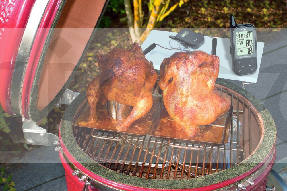 Speciální funkce: bezdrátový grilovací teploměr TFA KÜCHEN-CHEF TWIN má dva snímače z nerezové oceli. Pomocí nich můžete sledovat teplotu v troubě nebo grilu pomocí nastavení horního a spodního teplotního limitu nebo kontrolovat teplotu přímo ve středu dvou kusů masa najednou. A navíc ani nemusíte být v kuchyni, naměřené hodnoty jsou totiž bezdrátově přenášeny z vysílače do základny přístroje. Můžete se tak věnovat sami sobě nebo svým hostům, zatímco se vaše maso připravuje k dokonalosti. A až bude teplota přesně podle vašich představ, teploměr vás upozorní zvukovou signalizací.