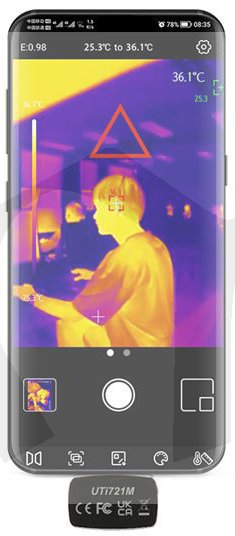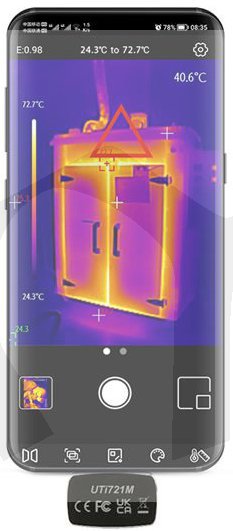 Termokamera UTi-721M je profesionální kamera pro chytré telefony pracující v oblasti infračerveného záření, určená pro měření povrchové teploty objektů v rozmezí od -20...+ 550°C. Kamera je určena pro připojení k běžnému chytrému telefonu, nejlépe vybavenému zásuvkou pro konektor typu USB-C. Je však možné kameru propojit s telefonem i přiloženými prodlužovacími kabely typu USB-C/USB-C nebo Mikro USB/USB-C. Na displeji mobilního telefonu můžete zobrazit tepelný obraz objektů, převedený do viditelného obrazu se zvolenou barevnou paletou: železná červená, duha, stupnice šedé, horká červená, černo bílá, láva, vysoce kontrastní duha. V reálném čase je možné nechat v obraze vyznačit místa s minimální i maximální teplotou s údajem ve stupních Celsia nebo Fahrenheita. Možnost nastavení alarmů při překročení určité teploty. Obraz z této kamery je možné prolínat (PIP) s obrazem přední nebo zadní kamery mobilního telefonu, přičemž současně lze infračervený obraz zrcadlit. Je možné analyzovat teplotu v bodě nebo vyznačené oblasti (obdélníku, kruhu, čáře apod.) měřeného objektu. Automatické nebo ruční spouštění uzávěrky fotoaparátu, uložení fotek nebo videí. Možnost úpravy fotek v aplikaci.