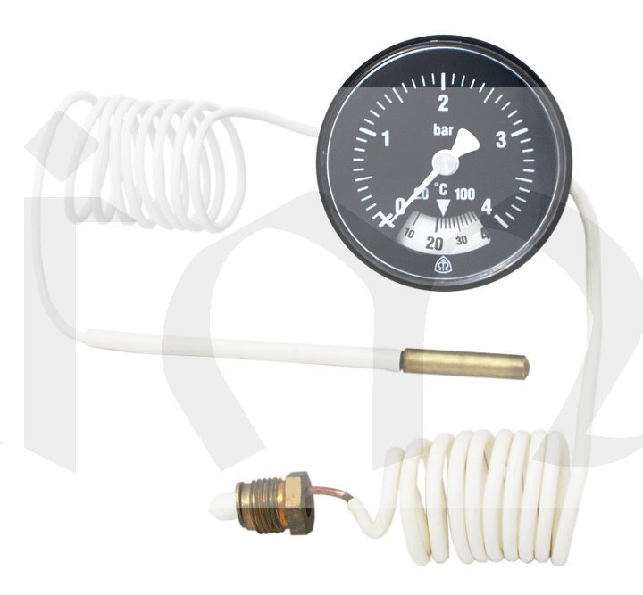 Kombinovaný přístroj pro měření tlaku a teploty v soustavách, kde místo snímání tlaku a teploty není totožné s místem odečtu. Tlakoměrová část může být použita v soustavě s kapalnými, popř. plynnými látkami, které nekrystalizují a nezpůsobují korozi slitin mědi.