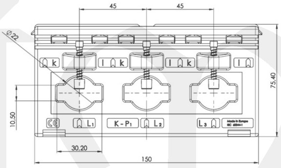 - Primární vodič plochý / kulatý: 30×10 mm / Ø22 mm
