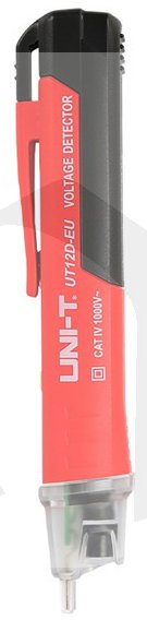 Bezkontaktní detektor střídavého napětí UT-12D-EU se zabudovanou svítilnou a akusticko-optickou synchronní výstražnou funkcí. Široce se používá při údržbě nízkonapěťových zařízení, jako jsou vodiče, kabely, zásuvky a další elektrické / elektronické přístroje. Je to velmi užitečný nástroj pro elektrikáře. Pouze umístěte hlavu senzoru do blízkosti testovaného objektu nebo do zásuvky s AC napětím. Při detekci střídavého napětí se rozsvítí červená LED na špičce a spustí se bzučák. Frekvence bzučáku a detekční LED se zvyšují, když se detektor přiblíží k testovanému objektu.