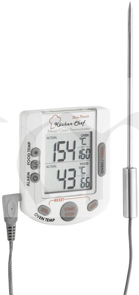 Digitální vpichový teploměr na maso 14.1503 KÜCHEN-CHEF je určený pro kontrolu teploty masa při jeho přípravě. Pomocí vpichového čidla teploměr zjistí aktuální teplotu uvnitř masa a v jeho okolí. Díky nastavitelnému teplotnímu alarmu Vás upozorní, jakmile je maso dostatečně upečené. Teploměr lze postavit na rovnou podložku nebo upevnit na zeď pomocí magnetu umístěného na zadní straně.