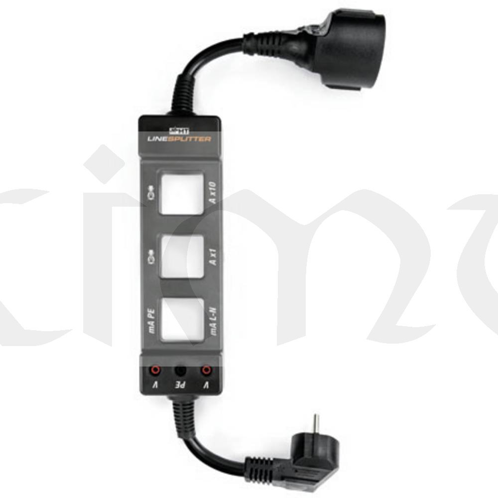 LINESPLITTER je velmi užitečný nástroj, který umožňuje jednoduše měřit protékající střídavý proud na zařízeních připojených do jednofázové zásuvky. LINESPLITTER je připojen vidlicí a zásuvkou mezi zásuvkou a zkoušeným přístrojem. LINESPLITTER rozděluje (fázový a nulový) a ochranný (PE) vodič, což umožňuje přímé měření unikajícího proudu v PE vodiči a nepřímé na L + N. LINESPLITTER má navíc dvě měřící smyčky pro měření (1x) a (10x desetinásobek) proudu fázového vodiče. LINESPLITTER nabízí 3 banánkové zdířky pro připojení standardních banánkových zástrček pro rychlé a bezpečné měření napětí (L-N, L-PE, N-PE).